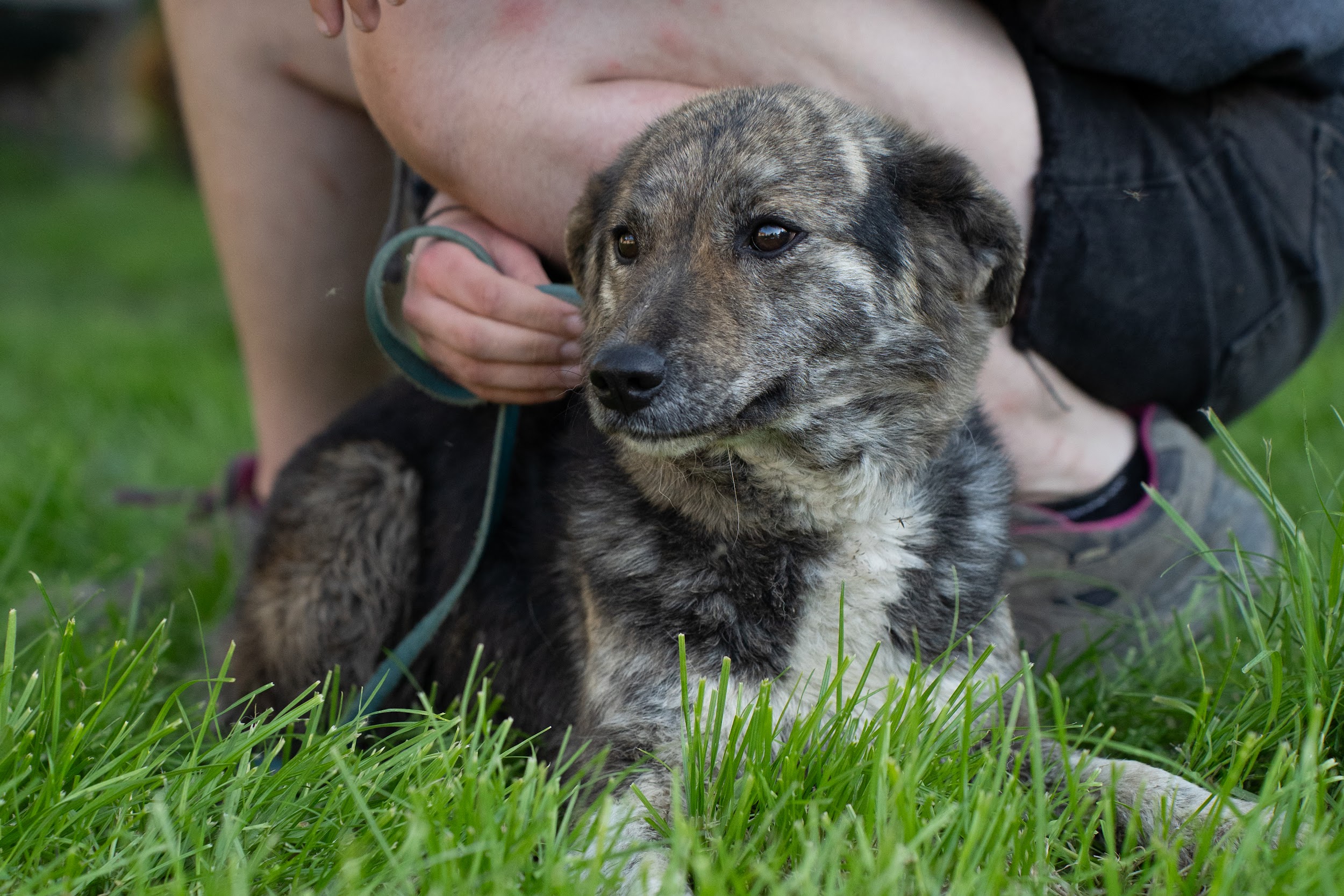 Found as a puppy, lived in a house. Friendly, good with other Hunde, walks on a leash.